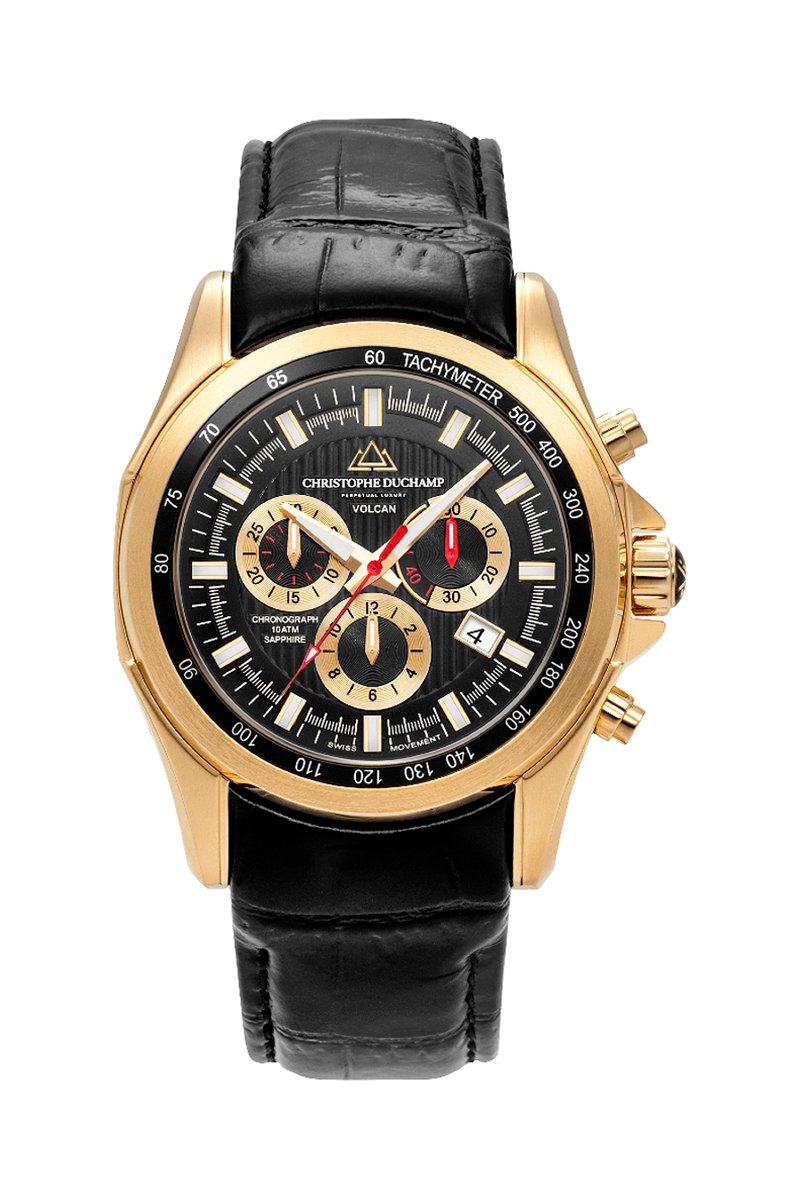 Leren Quartz Horloge Volcan - Tachymeter & Chronograaf - Zwart en Goudkleurig