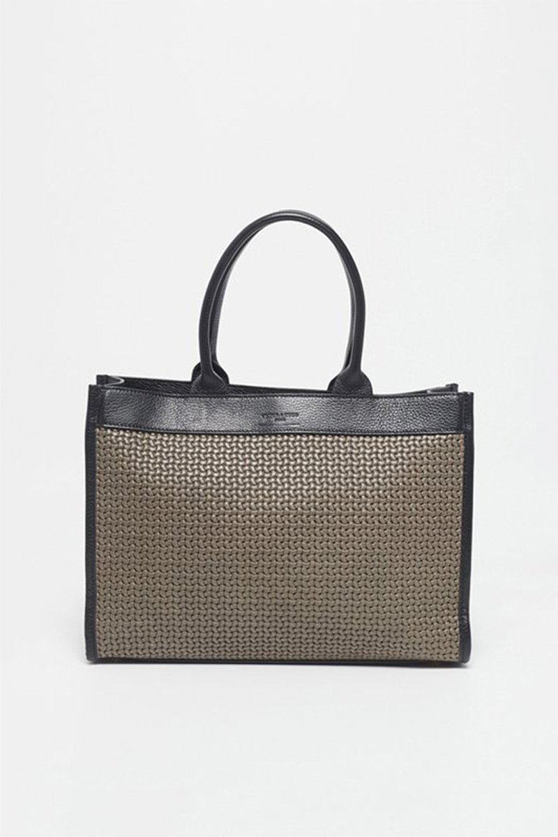Handtas van gevlochten leer.