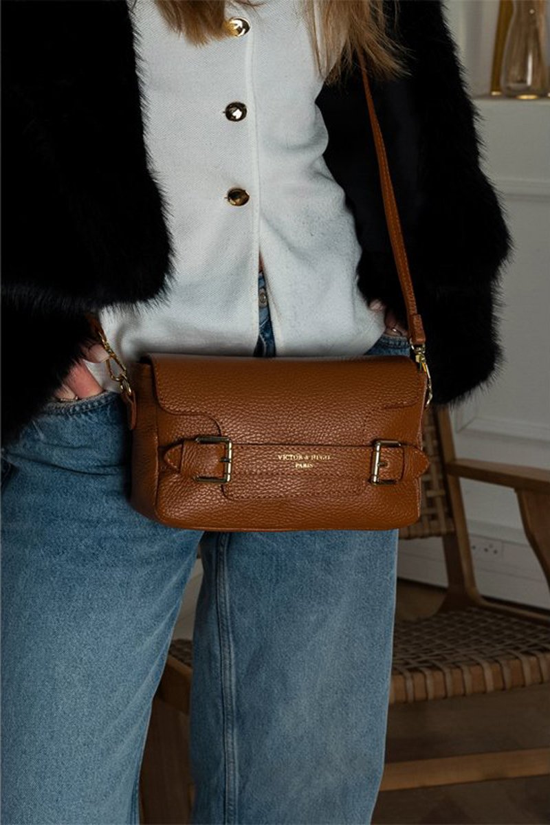Handtas met verstelbare en afneembare schouderband. Deze tas heeft een hoofdsluiting met ritssluiting, verborgen onder een leren flap. De flap sluit gemakkelijk met behulp van een magnetische drukknoop, waarbij stijl en praktische bruikbaarheid worden gecombineerd.