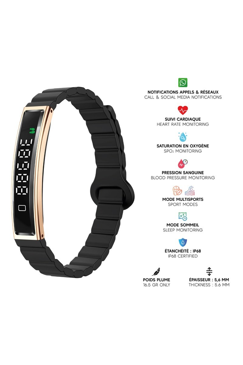 Beschikt over een hartslagmeter van de laatste generatie, de Thin-armband zorgt voor een regelmatige controle van je bloeddruk, Hartslagmeter en meting van het zuurstofaantal.