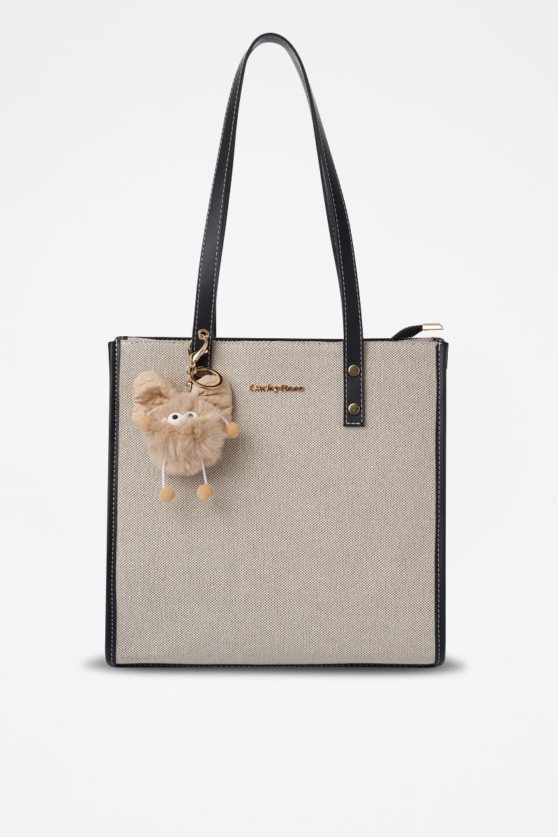 Sleutelhanger met detail van imitatiebont en metallic logo aan de voorkant.