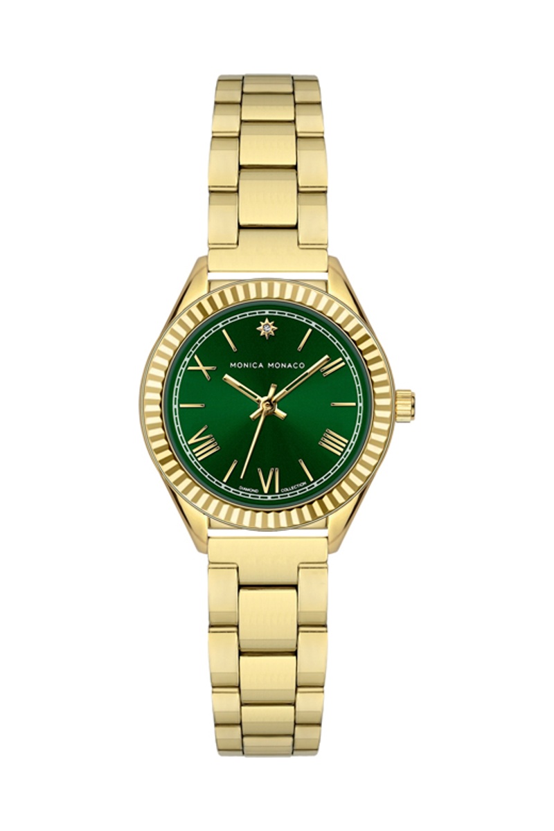 Stalen & Diamanten Quartz Horloge - Goudkleurig en Groen - Monica Monaco