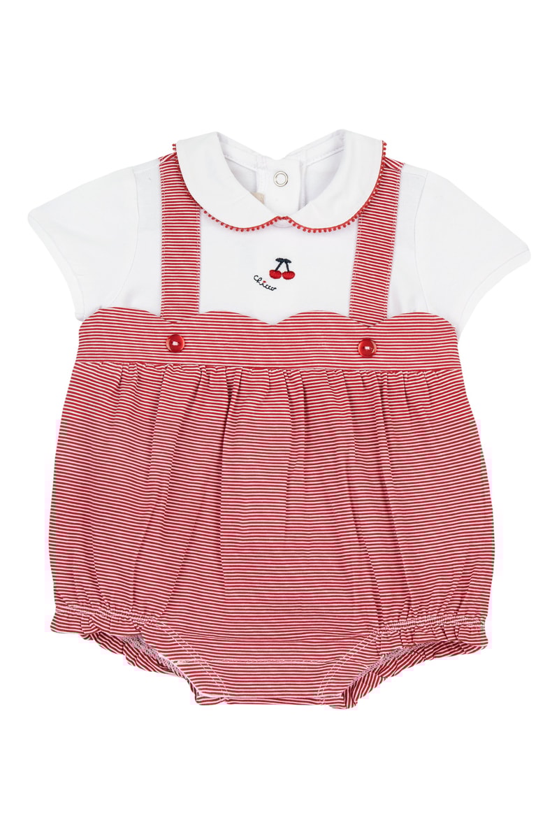 Kersenmotief. Logo en sierknopen aan de voorkant.