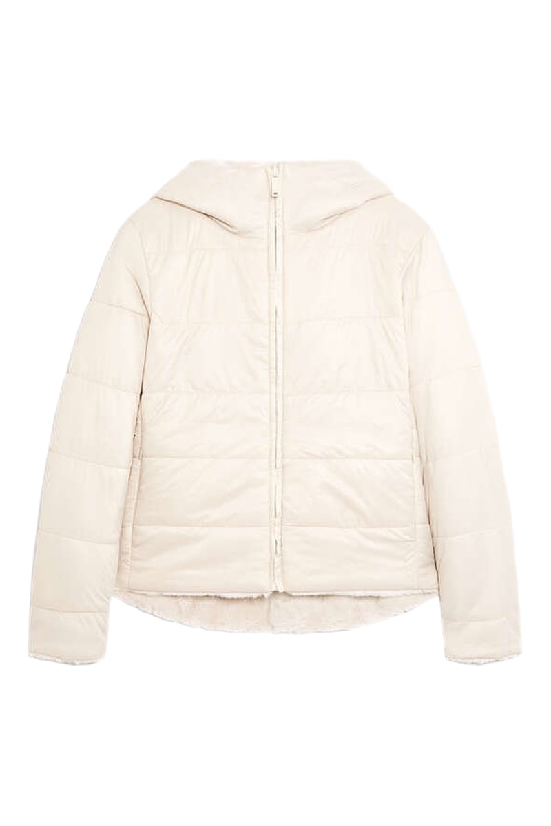 Dubbelzijdige gewatteerde jas met capuchon.