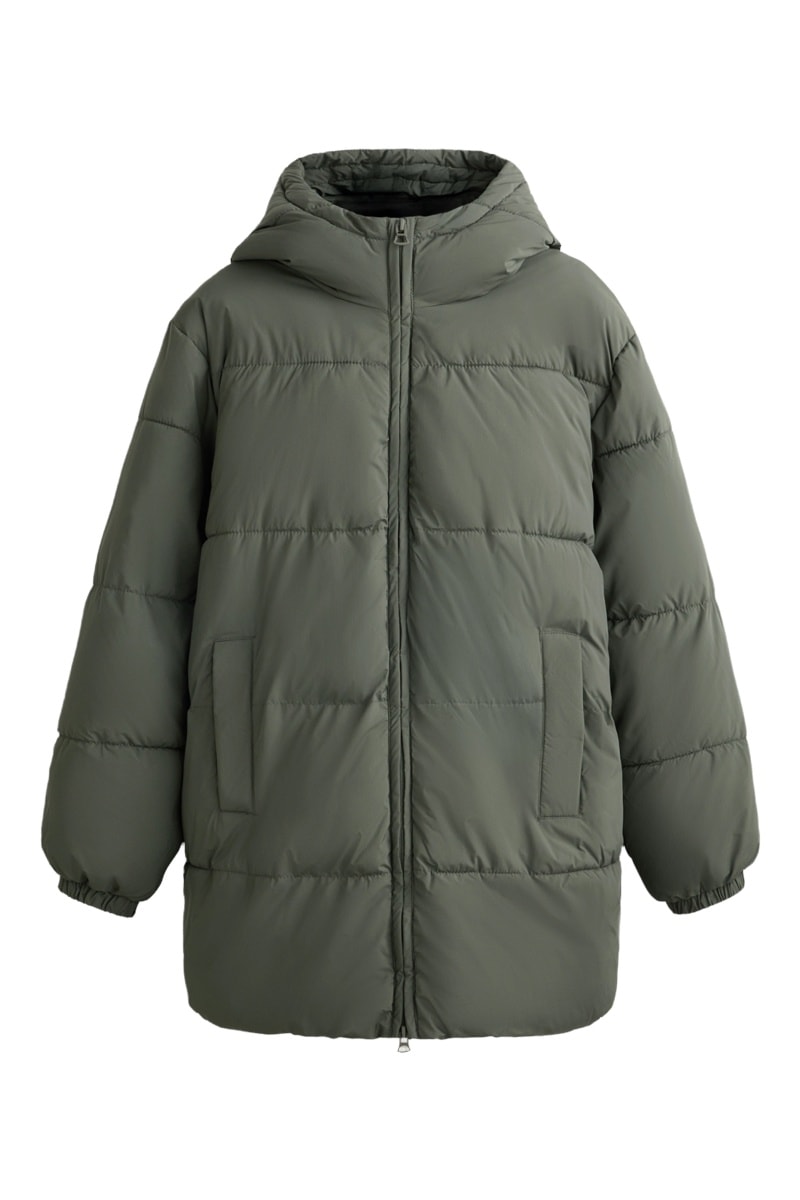 Gewatteerde jas met capuchon.