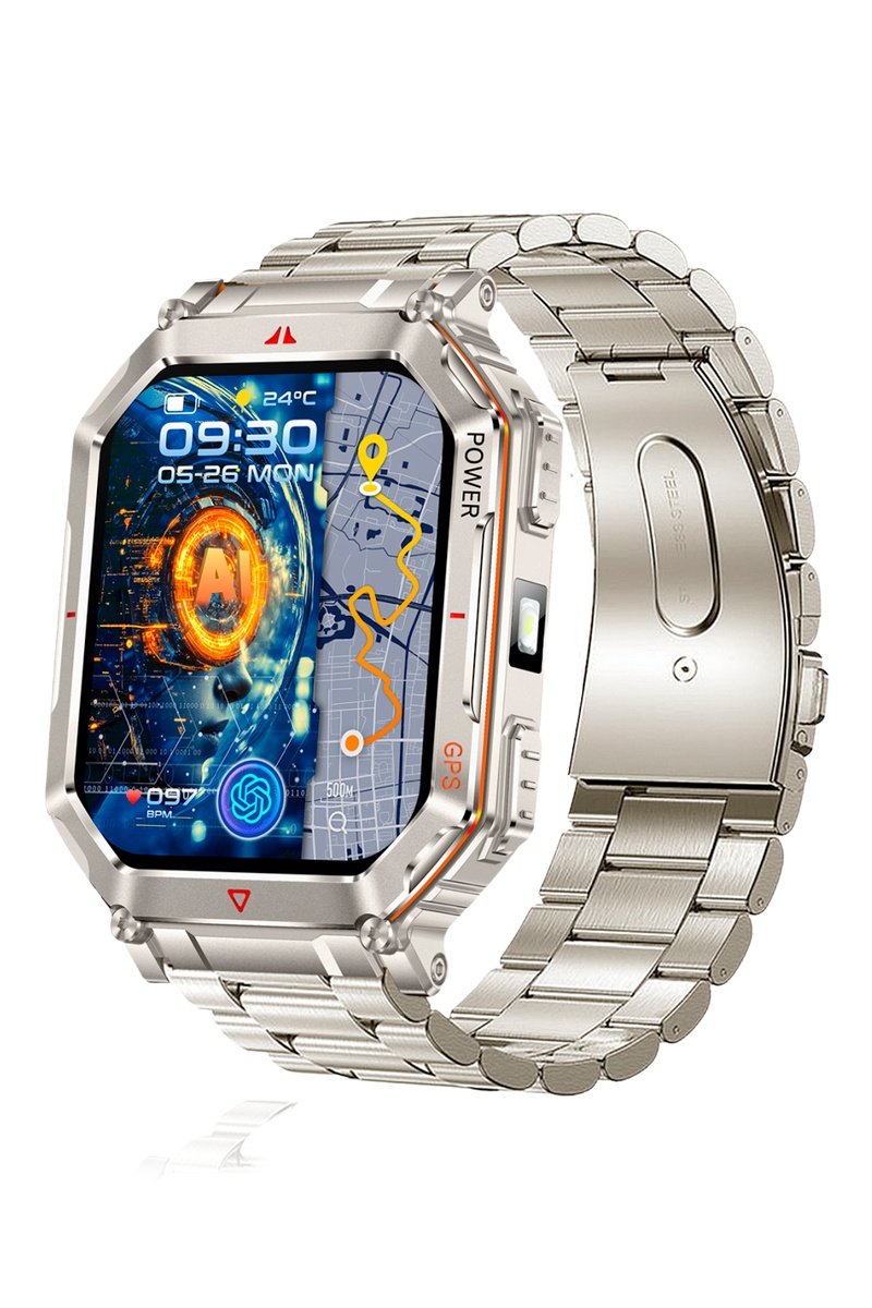 weersinformatie (app vereist), aanraakbare zaklamp met 4 modi, barometer (hoogte/druk), kompas, SOS-functie.