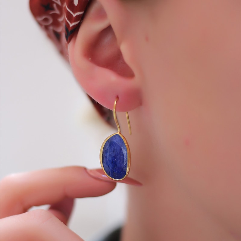 Val voor deze vergulde messing oorbellen, verfraaid met een lapis in schitterende kleuren. Elegant en licht, ze zullen een vleugje glamour en verfijning aan al jouw outfits brengen!