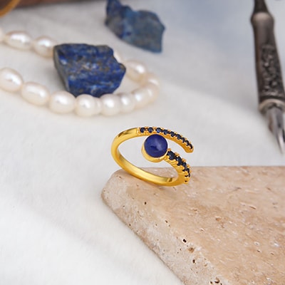 Succombeer aan de charme van deze goudvergulde messing ring, versierd met een prachtig gepolijste lapis en fonkelende zirkoonstenen. Een elegant accessoire dat een vleugje verfijning aan je outfit toevoegt, terwijl het de diepte en schoonheid van zijn stenen benadrukt. Een echt juweel van karakter om jouw stijl te verheffen. Wij houden ervan!