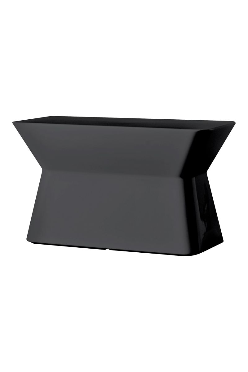 De pyramidevormen gaan op in een rechthoekige tuintafel met afgeronde hoeken.