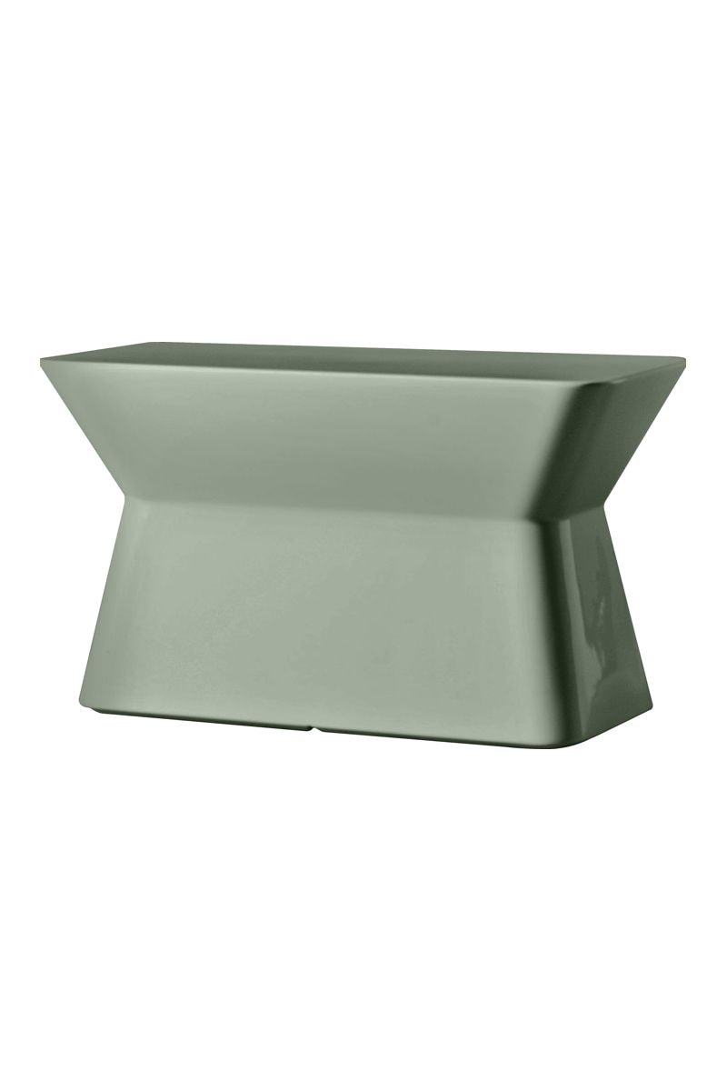 De pyramidevormen gaan op in een rechthoekige tuintafel met afgeronde hoeken.