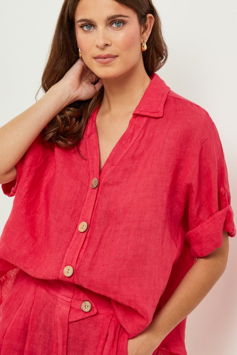 100% Linnen Blouse - Koraalrood - Koraalrood