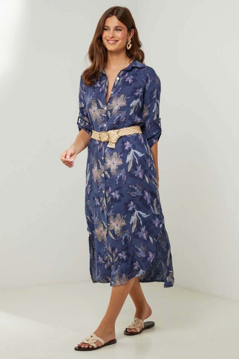 Lange blouse-jurk van linnen met driekwart mouwen.