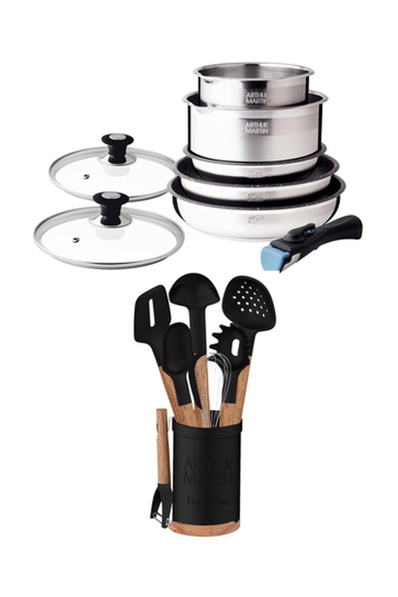 Roestvrijstalen Pannenset 8-Delig en 9 Acaciahouten en Silicone Keukenaccessoires