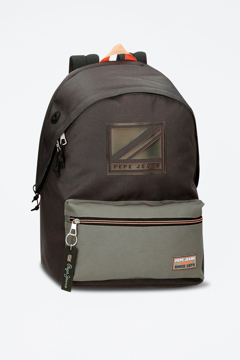 Contrasterende ritsvak met lipje, logo en embleem met logo aan de voorkant.