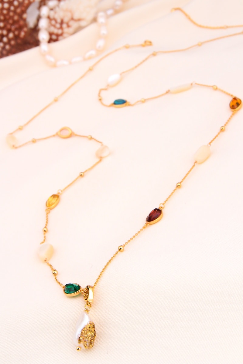Ketting van doublé geelgoud ingelegd met zirkonia's en kunstparels.