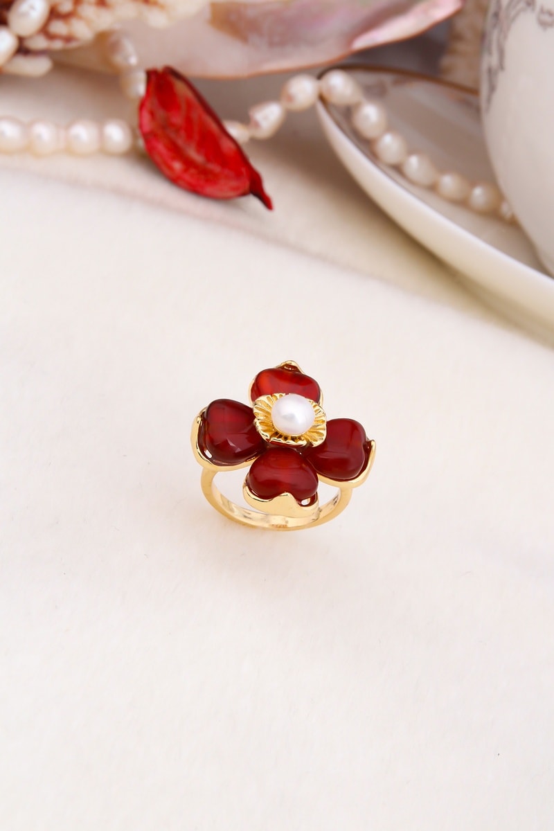 Verstelbare ring van doublé geelgoud ingelegd met 1 kunstparel en 4 kristallen.
