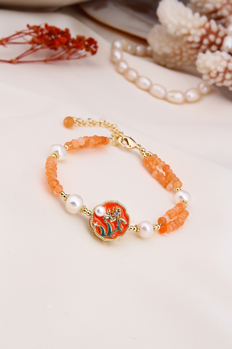 Armband van doublé geelgoud ingelegd met citrienen en kunstparels.