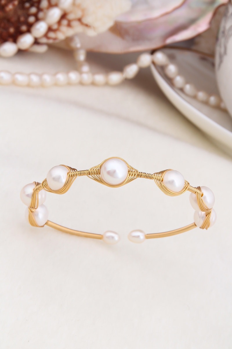 Open armband van doublé geelgoud ingelegd met kunstparels.