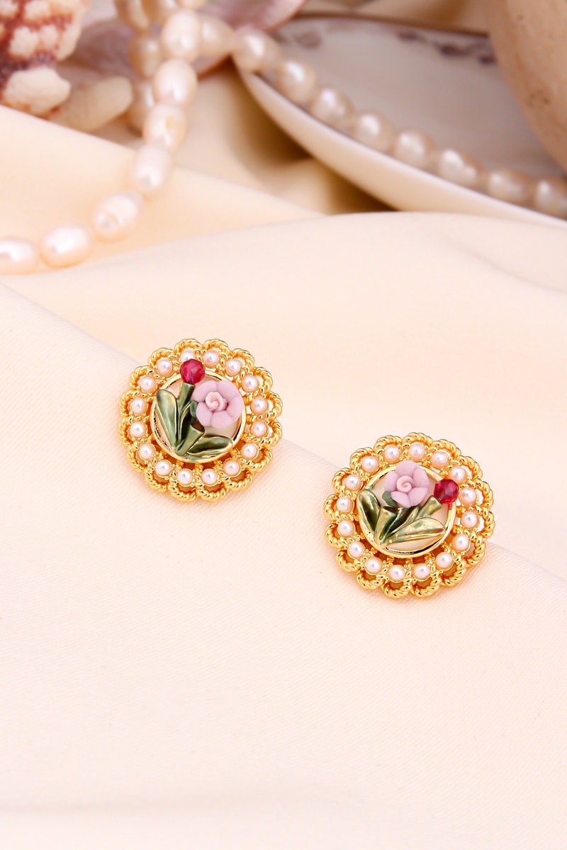 Oorbellen van doublé geelgoud ingelegd met 16 kunstparels en kristallen.
