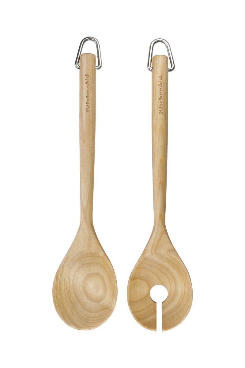Saladebestek van berkenhout, 1 vork en 1 lepel.