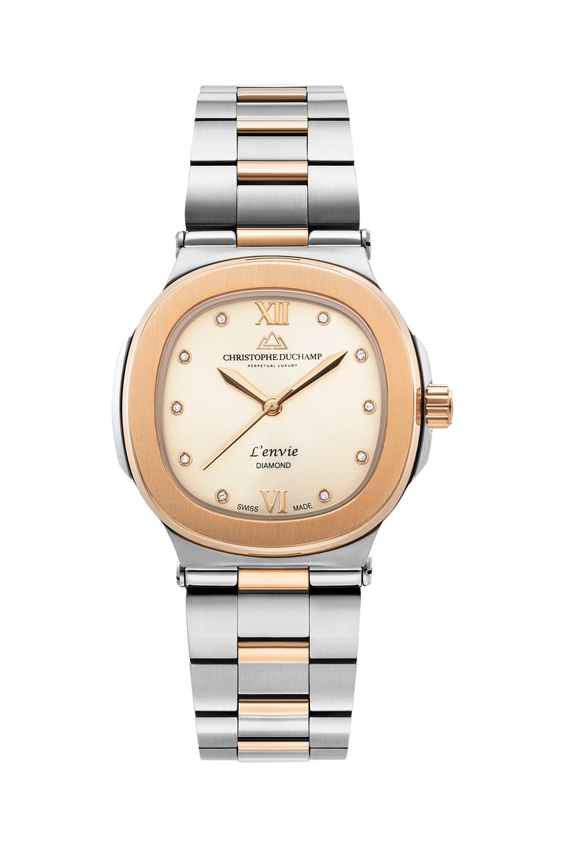 Wijzerplaat ingelegd met 10 diamanten.