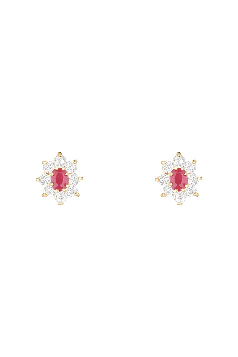Oorbellen van geelgoud ingelegd met 1 robijn en zirkonia's.