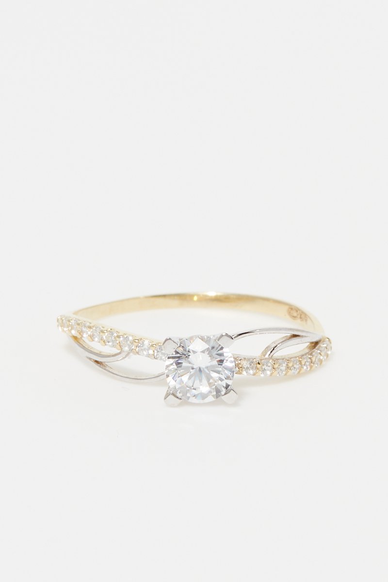 Ring van witgoud en geelgoud ingelegd met zirkonia's.