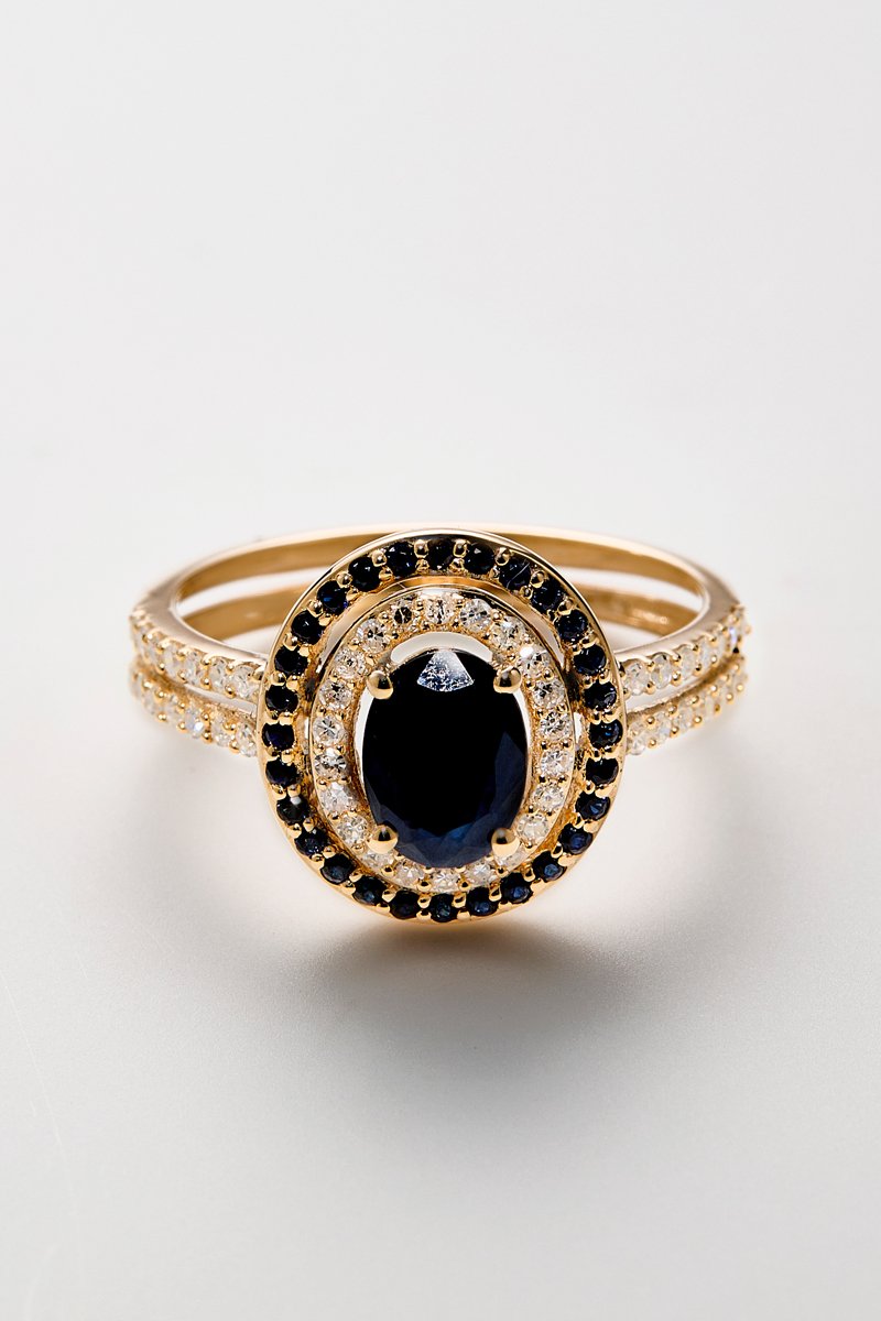 Materiaal: geelgoud 375/1000, diamanten 0,25 karaat/50, saffieren 0,17 karaat/28 en saffier 1,08 karaat/1