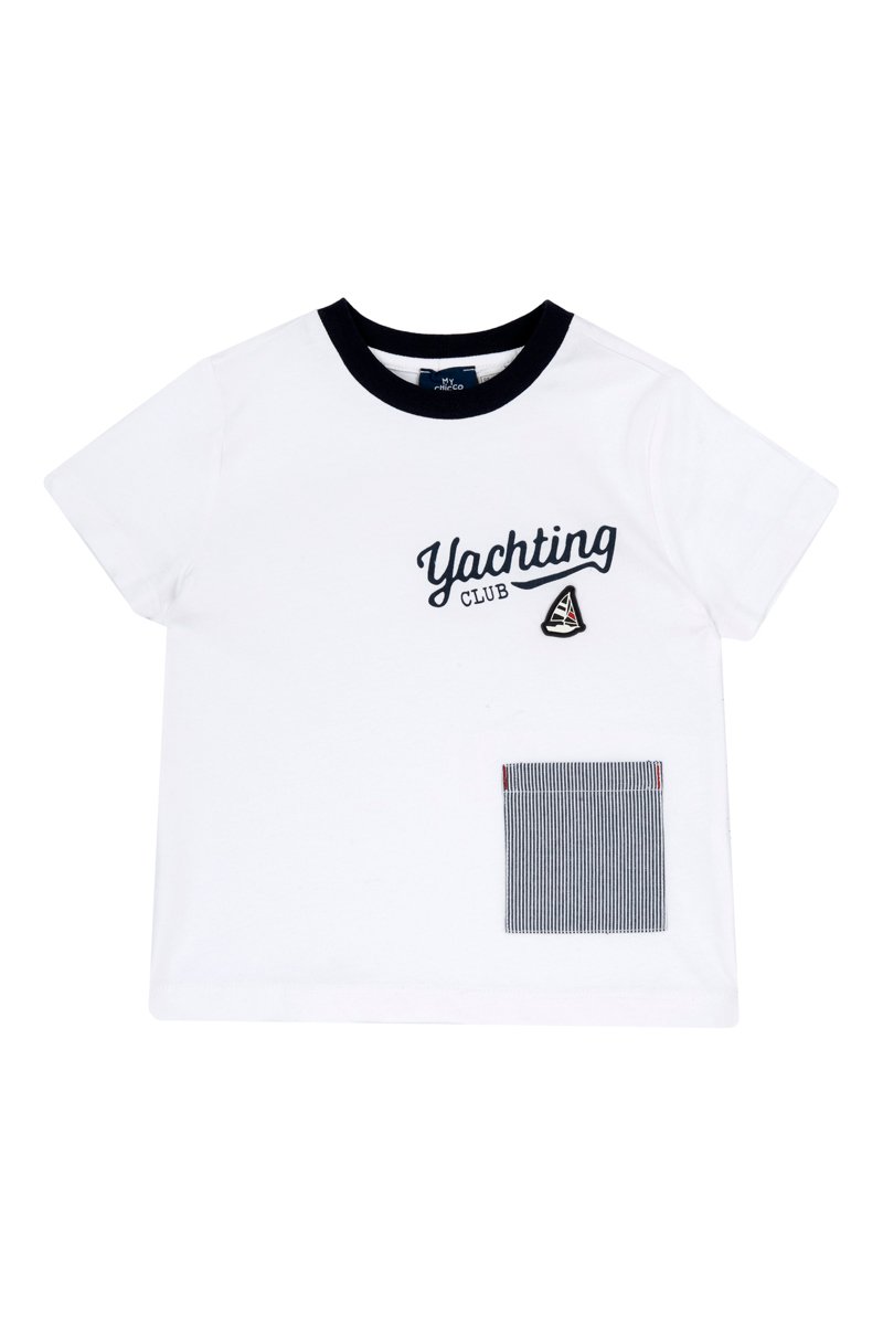 Zak met streepmotief, belettering en detail in yachtvorm aan de voorkant