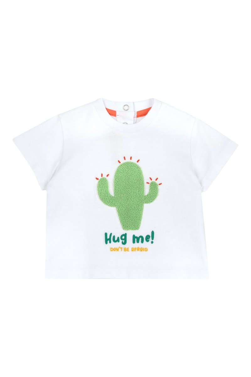 Belettering en geborduurd cactusmotief aan de voorkant.