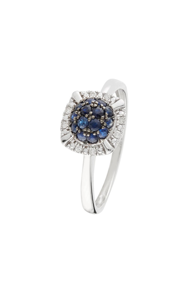 Materiaal: witgoud 375/1000, diamanten 0,036 karaat/8 en saffieren 0,532 karaat/14