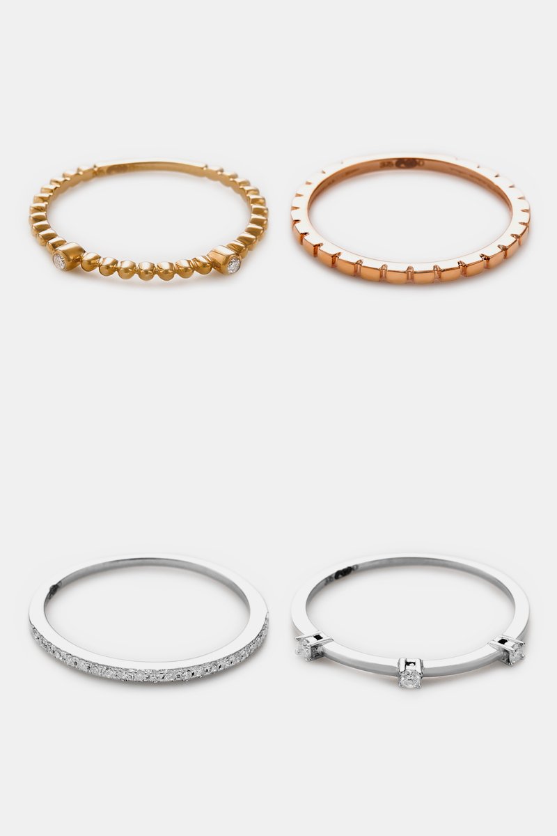 4 verlovingsringen van driekleurig goud ingelegd met 27 diamanten.