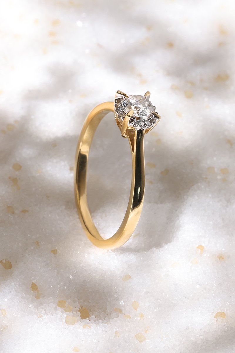Verlovingsring van geelgoud ingelegd met 13 diamanten.