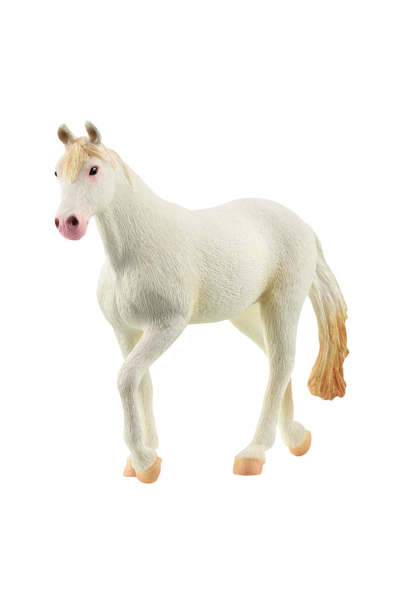 De merrie heeft een witte vacht, witte hoeven en lichtroze neusgaten: de Camarillo merrie os zo mooi!
