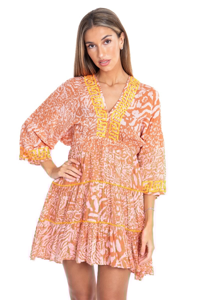 Geborduurd decoratief motief bij de hals, op de mouwen en aan de voorkant.