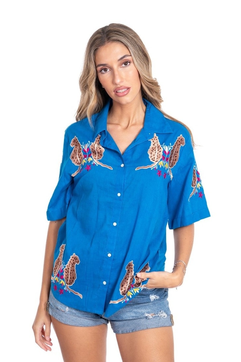 Geborduurde luipaardprint en bloemmotief op de mouwen en aan de voorkant.