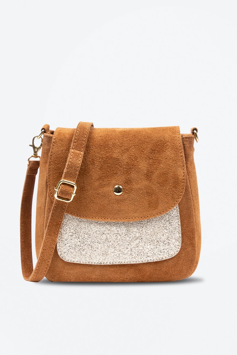 Schoudertas van nubuck en leer met gelamineerd effect.