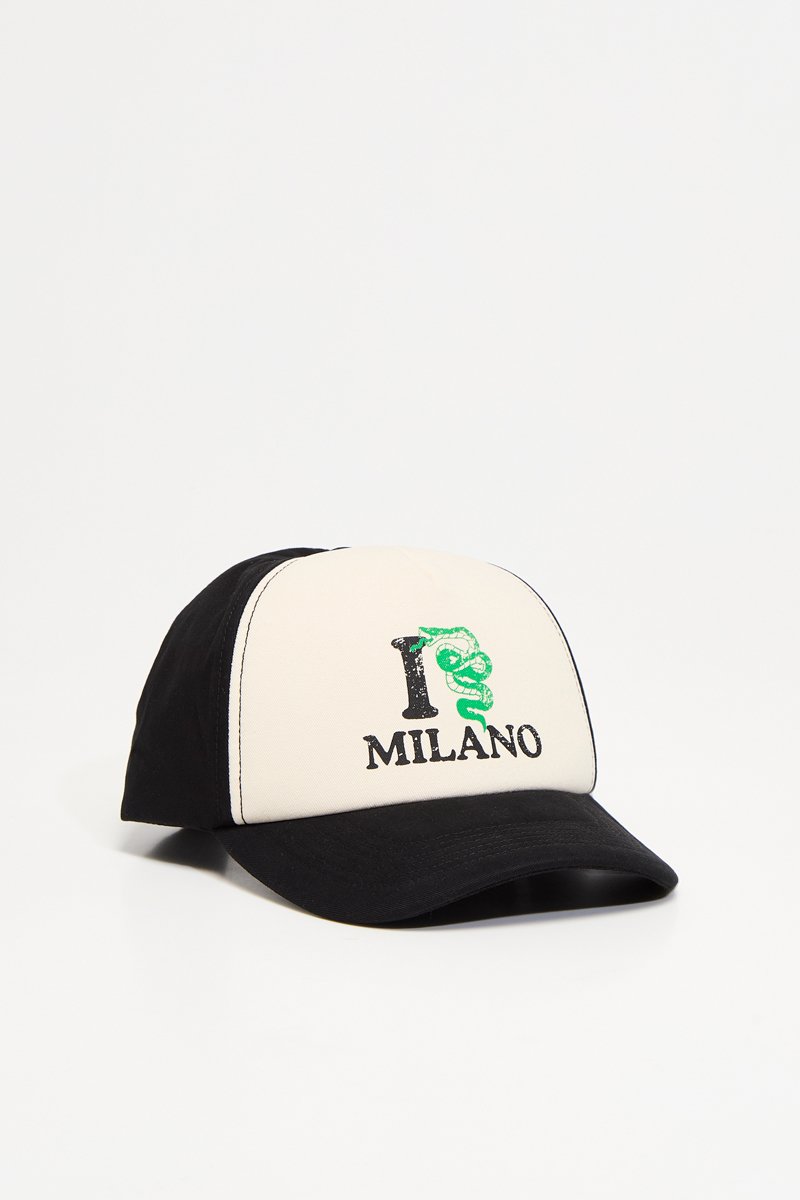 Belettering en slangenmotief aan de voorkant.