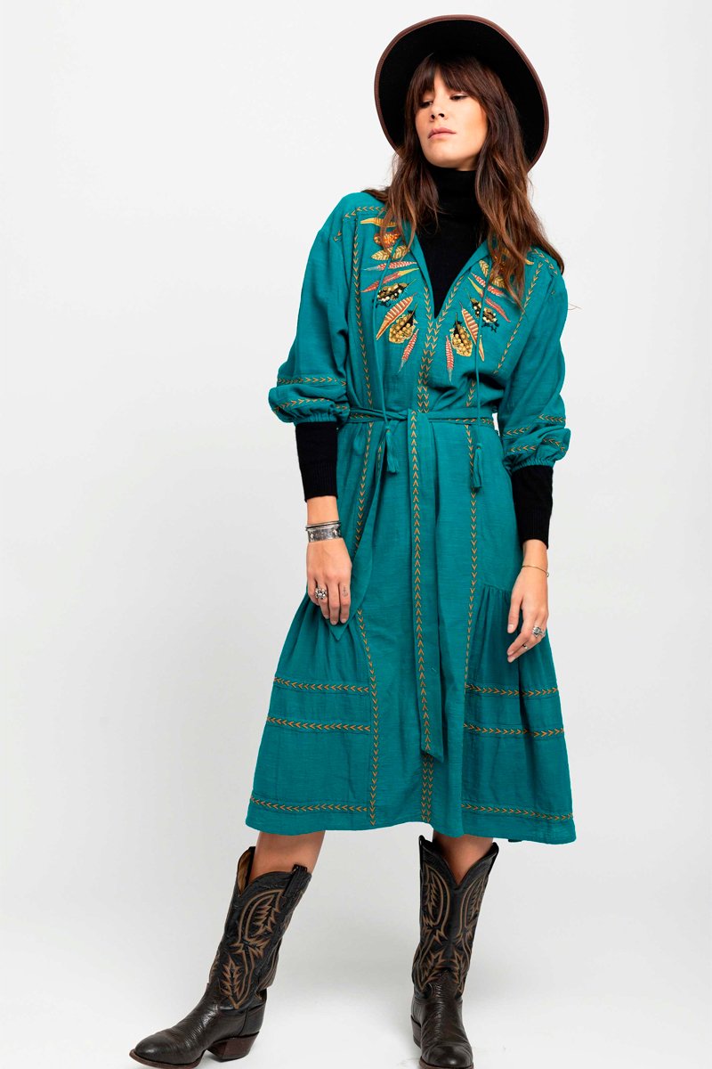 Geborduurd veren- en pijlenmotief aan de voorkant en aan de achterkant.
