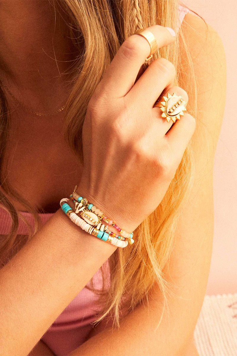 Armband van verguld metaal ingelegd met rondjes met schelp, glasparels, kirstal, witte kwarts, spinellen, kunstturkooizen, met granaten en glaskralen.