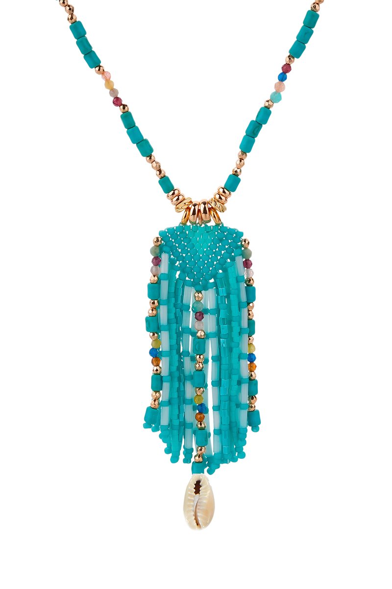 Lange ketting van verguld metaal ingelegd met kunstparels, 1 schelp en kristallen.