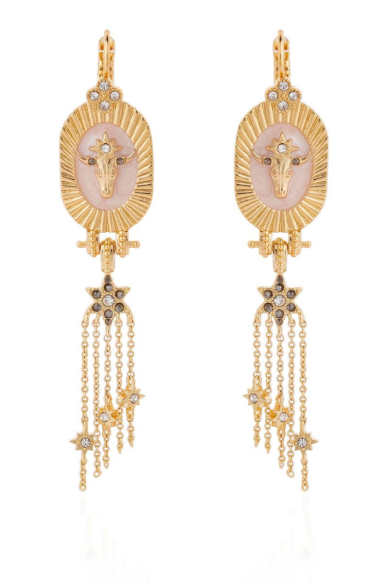 Hangende oorbellen van verguld metaal ingelegd met kristallen.