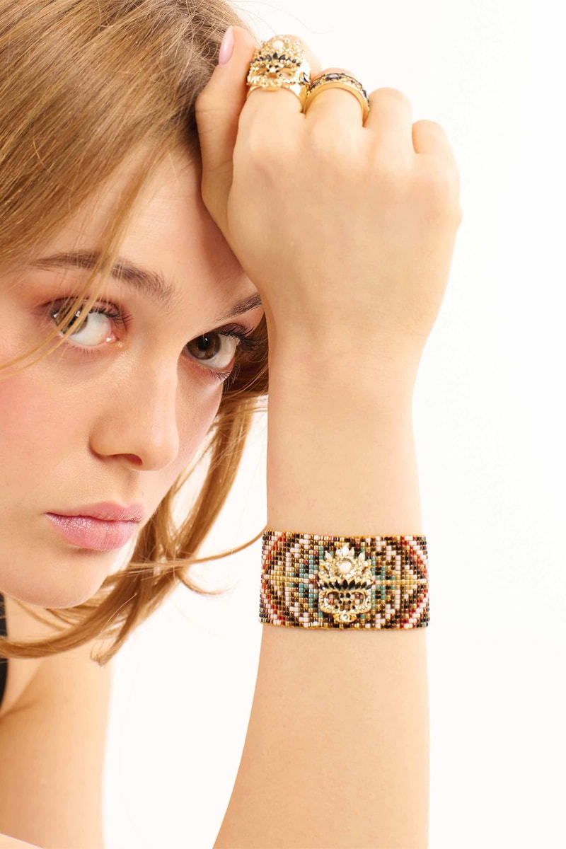 Manchetarmband ingelegd met kunstparels en kristallen.