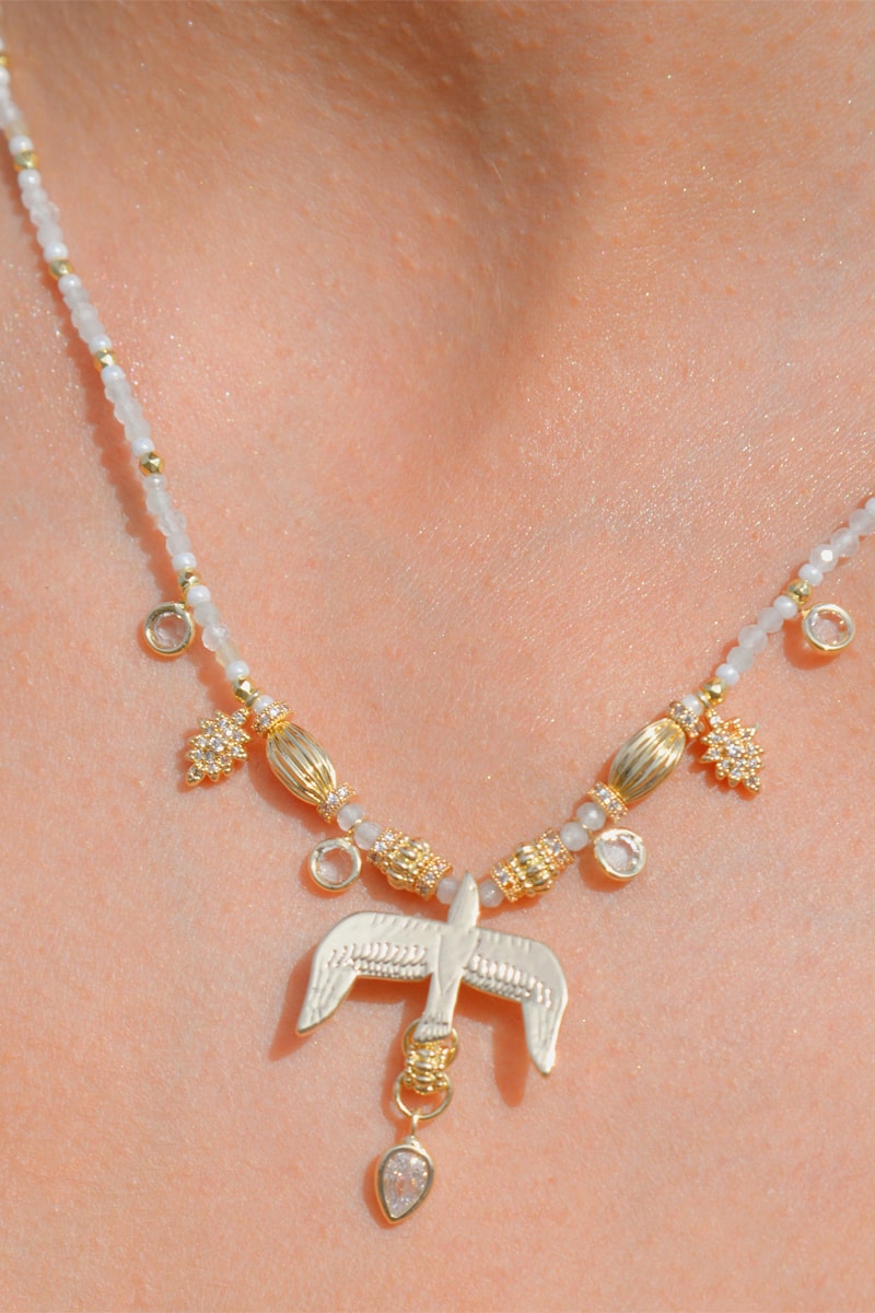 Ketting verguld met geelgoud ingelegd met zirkonia’s, maanstenen en kunstparels.