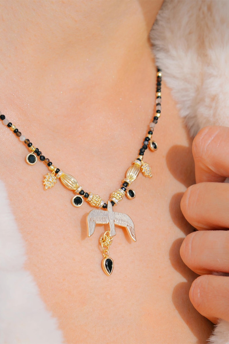 Ketting verguld met geelgoud ingelegd met zirkonia’s, labradorieten en kunstparels.