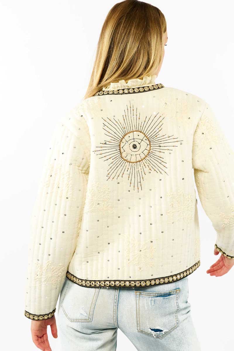 Details van metaal bij de hals, op de mouwen, aan de voorkant en aan de onderkant.